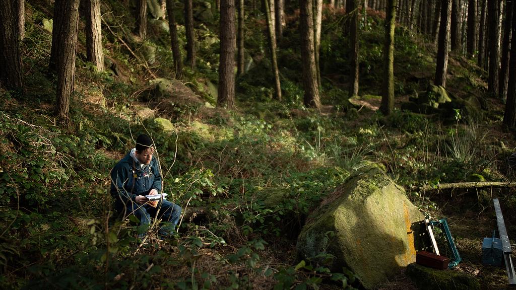 I love the location where we shot this film. It couldn't have been any closer to what I was imagining throughout the whole process of creating the story. I was very interested in cultivating a transatlantic look to the film in the hope that it would allow it to transpose easily for a North American audience. This is an aesthetic that I have always been drawn to - hence the denim overalls, metal toolboxes and large pine trees. This large and expansive location also helped me to portray these two big, strong working men as small, alone and vulnerable. Just as the power line cuts through the natural beauty of the forest, the men's lack of emotional communication cuts through them and cuts them off from the world.