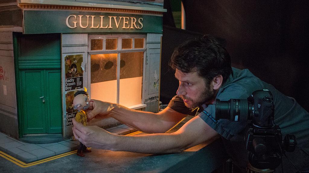 To make the locations, Steve (the film’s other animator) and I went out and took photographs of all the spots we wanted to use; all the pubs and shops and the chippy. Then we made semi-relief backgrounds that were part-models, part-photographs. Everyone who’s featured in it was so supportive: Gullivers, Empire Exchange, the Kingfisher chippy. All those people came together to help me tell this story and they were buzzing when they saw their businesses recreated as scaled down models.